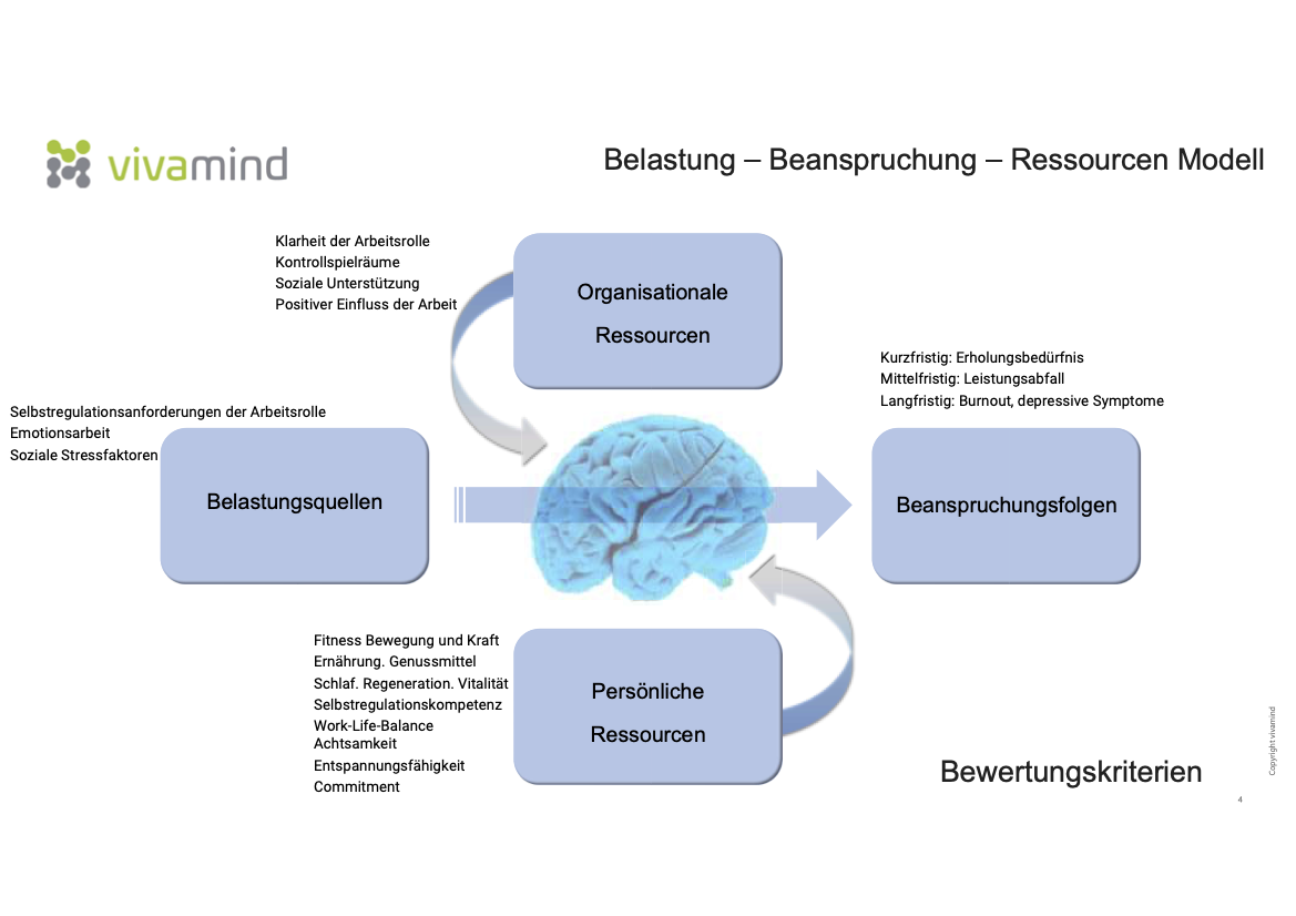 Das Modell wurde für vivamind entwickelt von Prof. Stefan Diestel, Lehrstuhl für Wirtschafts-Psychologie der Universität Wuppertal. Es beschreibt die stärkenden und belastenden Faktoren.